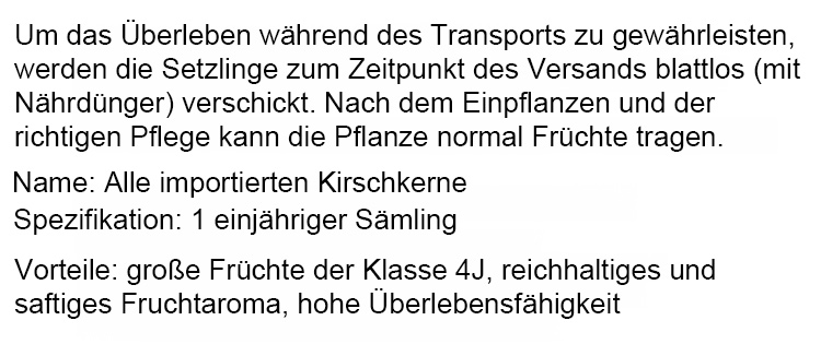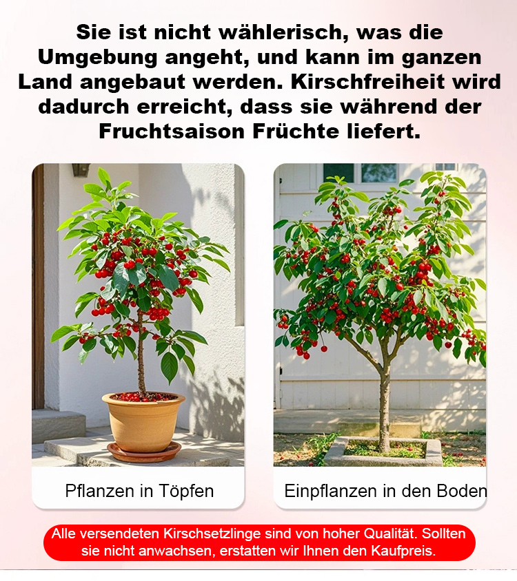 Sofortige Ernte, seltene Kirschsorten – jetzt pflanzen und dieses Jahr genießen! 💯 Garantierter Erfolg: Wir liefern kräftige, zweijährige Pflanzen mit einer 100% Wachstumsgarantie. Kein Wachstum? Sofortiger Ersatz oder Geld zurück!